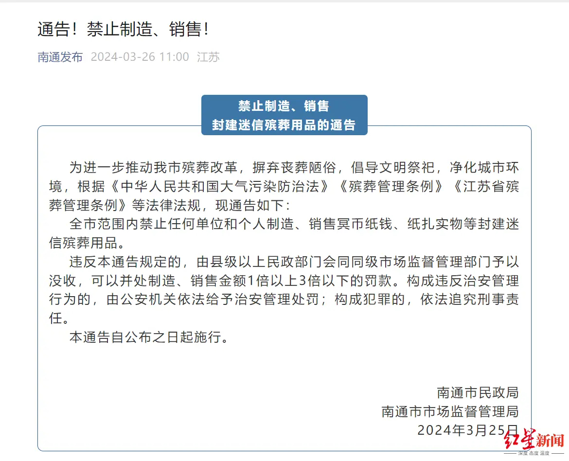 3月26日,江苏南通市民政局和南通市市场监督管理局通过“南通发布”发布了一条“禁止制造、销售封建迷信殡葬用品的通告”,其中规定全市范围内禁止任何单位和个人制造、销售冥币纸钱、纸扎实物等封建迷信殡葬用品,随后引发关注。