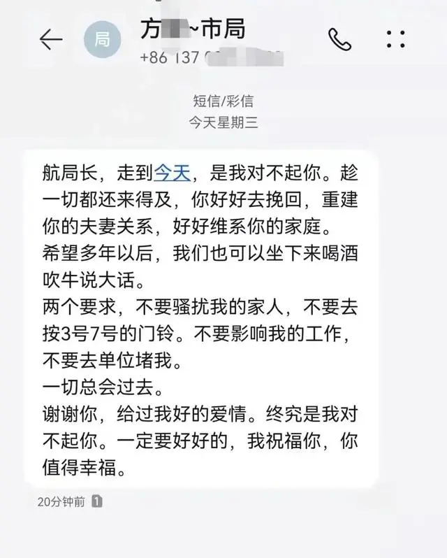 举报者还公布了疑出轨女子方某发给史某妻子的短信:“灵魂是分高低贵贱之分的,你确实是在社会底层”“说实话,觉得你很可怜”“我的人生比你美好太多太多,我不想跟烂人烂事纠缠。管好你的男人,提升一下你自己……”同时还有方某发给史某的短信:“局长,走到今天,是我对不起你。趁一切都还来得及,你好好去挽回,重建你的夫妻关系,好好维系你的家庭。希望多年以后,我们也可以坐下来喝酒吹牛说大话。两个要求,不要骚扰我的家人,不要去按3号7号的门铃。不要影响我的工作,不要去单位堵我。一切总会过去。谢谢你,给过我好的爱情。终究是我对不起你。一定要好好的,我祝福你,你值得幸福。”