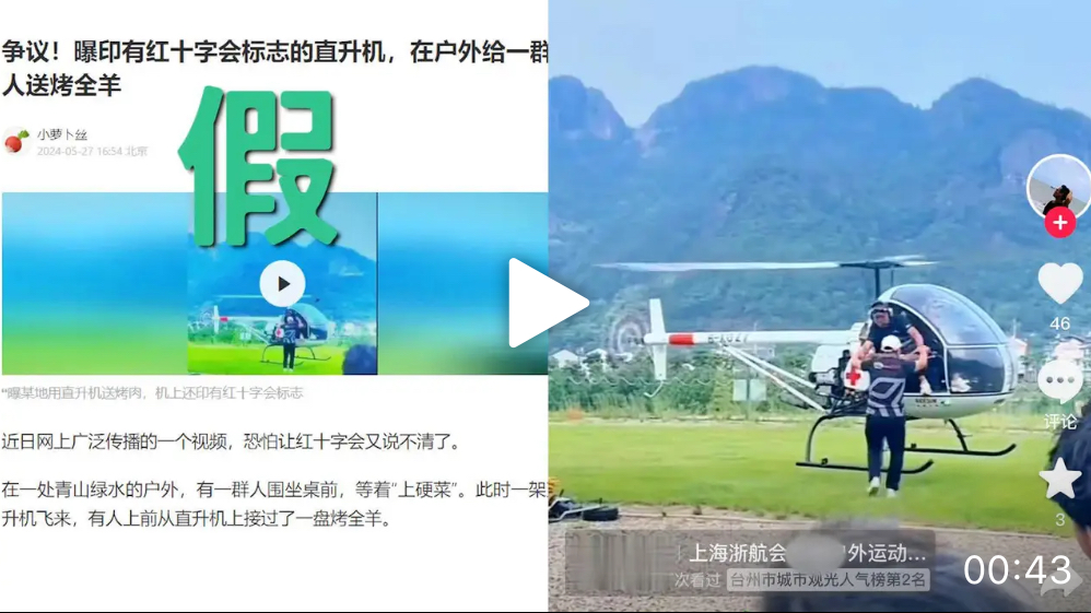 红会用直升机送烤全羊?飞机拥有者为某网红,当日演练后没撕(视频截图)
