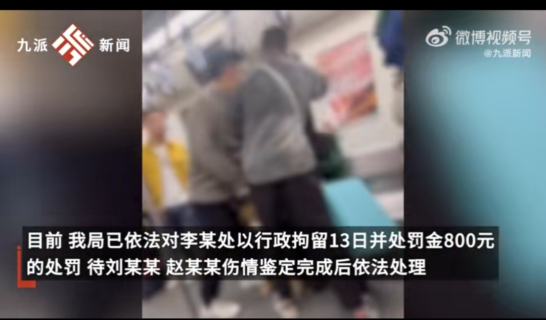 11月8日,成都市公安局轨道公交分局发布警方通报:11月7日12时许,李某(男,41岁)、刘某某(女,29岁,李某同行人员)与赵某某(女,22岁)在乘坐成都地铁3号线时,因座位纠纷发生口角,后引发肢体冲突。目前,我局已依法对李某处以行政拘留13日并处罚金800元的处罚;待刘某某、赵某某伤情鉴定完成后依法处理。#成都警方通报地铁3号线打人事件#