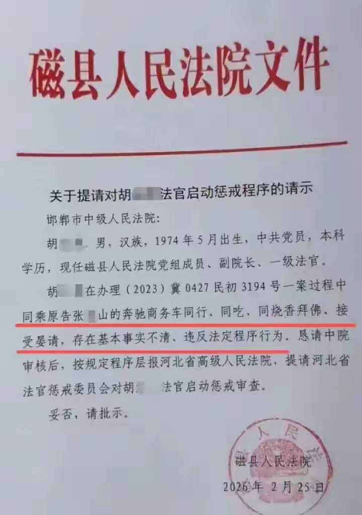 近日,一名网友通过短视频平台发布了一份《关于提请对胡某法官启动惩戒程序的请示》,其中提及,胡某,男,1974年5月生人,现任磁县法院党组成员、副院长、一级法官。胡某在办理(2023)冀0427民初3194号一案过程中,同乘原告张某山的奔驰商务车同行、同吃、同烧香拜佛、接受宴请,存在基本事实不清、违反法定程序行为。恳请邯郸市中院审核后,按规定程序层报河北省高院,提请河北省法官惩戒委员会,对胡某法官启动惩戒审查。该“请示”落款“磁县人民法院”,日期为2026年2月25日。