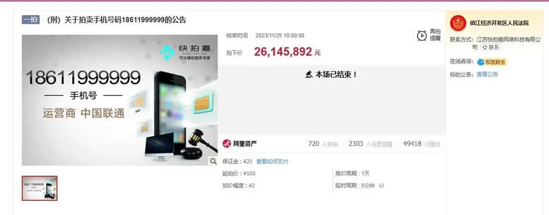竞买公告显示,“1xxxx999999”是一个中国联通的手机号码,该号码起拍价为100元,保证金为20元,开拍时间在2023年11月24日10时至2023年11月25日10时。24小时的竞价周期,共吸引720人报名参与拍卖,49418人次围观。