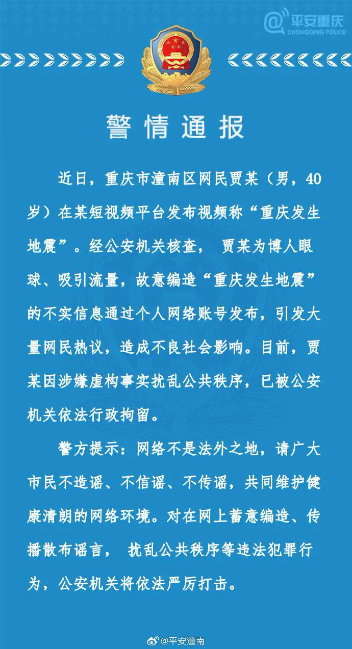 北京·界面新闻官方网易号 「原标题:重庆发生地震?警方:男子为博眼球赚流量造谣被拘」 重庆市潼南区公安局通报,近日,重庆市潼南区网民贾某(男,40岁)在某短视频平台发布视频称“重庆发生地震”。经公安机关核查,贾某为博人眼球、吸引流量,故意编造“重庆发生地震”的不实信息通过个人网络账号发布,引发大量网民热议,造成不良社会影响。 目前,贾某因涉嫌虚构事实扰乱公共秩序,已被公安机关依法行政拘留。 文章导航 山西阳高县人民法院审判长回应网传“订婚强奸案”判刑依据 北京今年最后一期摇号结束,超六成指标被无车家庭摇中