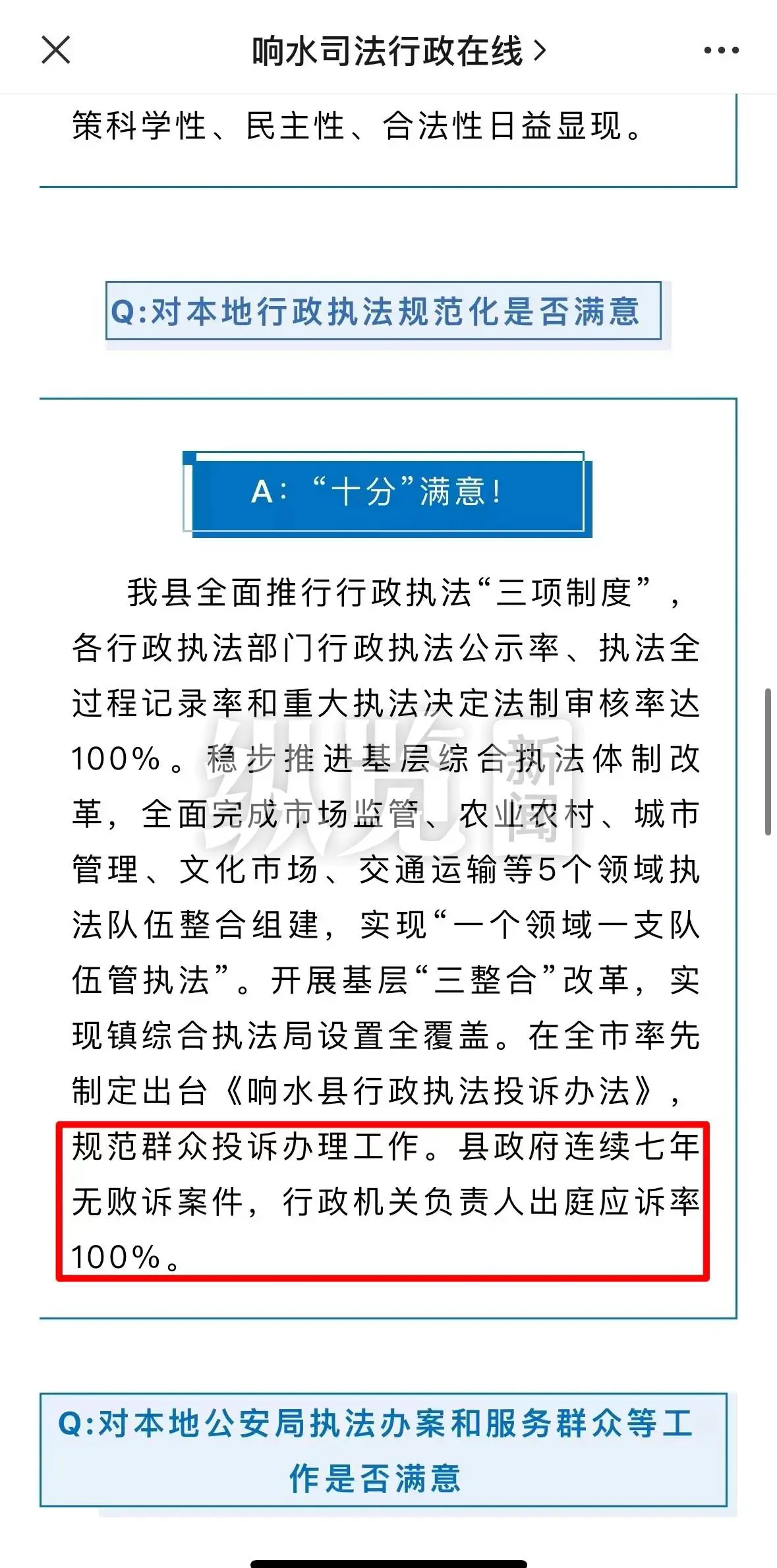 27日,纵览新闻(报料微信:ZLXWBL2023)记者从“响水融媒”微信公众号找到了这篇名为《请您为法治响水点赞》的文章,发布时间是2022年11月18日。文章开头写道,如响水县居民接到法治建设群众满意度测评电话,希望能作出“十分满意”的评价,随后文章对居民可能被询问到的问题作出详细解答。在“对本地行政执法规范化是否满意”这一问题的解答中,文章写道,“县政府连续七年无败诉案件,行政机关负责人出庭应诉率100%”。