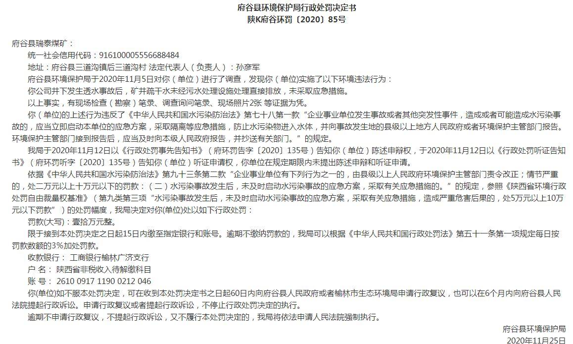 矿井疏干水直接排放,陕西府谷县瑞泰煤矿被罚十万元